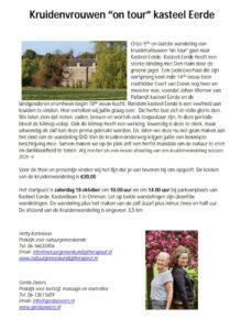 Het startpunt is zaterdag 18 oktober om 10.00 uur en om 14.00 uur bij parkeerplaats van Kasteel Eerde, Kasteellaan 1 in Ommen. Let op beide wandelingen zijn dezelfde wandelingen. De wandeling plus het maken van de zalf duurt plus minus twee en half uur. De afstand van de kruidenwandeling is ongeveer 3,5 km